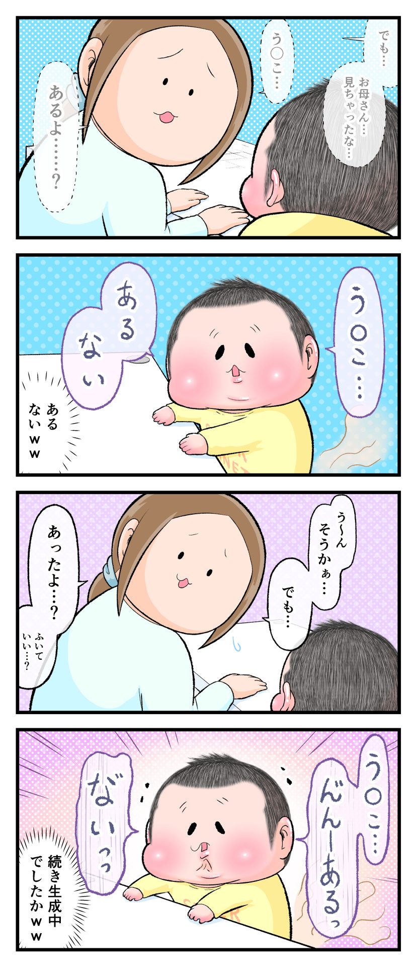 取り調べ中の出来事2021.04.162歳 育児漫画 ぷにすけ:2歳3ヶ月頃 ラフ絵 あとがき当時次男は、う〇こ出てない時に出てると言って、出てる時に出てないと言う事がよくありましたw出た(実際は出ていない) = 便意だけ催してる出てない(実際は出てる) = 続きあるからまだ拭かないで…ということなのかな…?と解釈していますw 5 同じカテゴリの記事 思わず二度聞き…!7歳ぷにすけの人生名言→からのギャップ ぷにおにとっての学校とは…?時間割より気になる“あれ” なにその内緒話…!給食のチーズドリアでぷにおが秘密にしたかったあるできごととは…!? #22 巻き起こせ!正の”時短”スパイラル!使い方でこんなに変わる、洗濯機のヒミツ 登校前のギリギリ時間!「待ってほしい」8歳が放った一言が強すぎた…! お母さんの誕生日、欲しいものは…?子どもたちに現実を突きつけられた話~授乳中の、胸が痛む一人時間 生後4ヶ月の赤ちゃんが会長すぎる…!ファミレスでの“会議みたいなしぐさ”がたまらない 生後2ヶ月の赤ちゃんと初ファミレスへ→まさかの「4対1席」に!?子連れ外食のコツも 「寒っ…!」7ヶ月赤ちゃん、ムチムチボディーを震わせててたまらなかった件 #21 テッカテカの君が尊い!はじめての育児で、ついマメにやっちゃう”ひと手間” スパゲティーニプニオニーニ☆8歳息子「目から謎のパスタ」コントの話 腹筋すご!もとの姿勢に戻ろうとする5ヶ月赤ちゃん 5ヶ月赤ちゃんの妹を見つめる兄がつい出た言葉…☆ 離乳食後ににおい…?6ヶ月赤ちゃんのニヤけ顔が何とも言えなかった 6ヶ月赤ちゃんがタグに夢中!ハムハムし尽くした結果… 6ヶ月ぷにみ。おすわりしながら、そっと見上げてくれたあの笑顔 #20 その「ちぱちぱ」は反則~!抱っこ紐の中で1歳息子がくすぐったい攻撃…! 5ヶ月ぷにみ、離乳食デビュー。初めての味への反応は…?③ 5ヶ月ぷにみ、離乳食デビュー。初めての味への反応は…?② 5ヶ月ぷにみ、離乳食デビュー。初めての味への反応は…?① 何かを味わってる?4ヶ月赤ちゃんのお口の動きが尊い件 なんだこの口の動きは…生後4ヶ月ぷにみ、もぐもぐを真似する 「こっち見て~☆」3ヶ月ぷにみ、授乳中のアイコンタクトが止まらない #19 妙に腰をくねらせる~!息子の「出してるよ」サインが、バリエーション豊富な件 ハイパーご機嫌おっぱいタイム☆4ヶ月ぷにみのあんよの動き 5ヶ月ぷにみ、コロコロからのこの動きがたまらない 立たせると笑う!?立つのが好きすぎる3〜4ヶ月のぷにみ 2ヶ月で立ちたい!?おむつ替え中に足ピーンするぷにみ ぷにみ会長にメロメロすぎるぷにすけ社長㉑ #18 「子育てに理解ある職場か」だけが判断基準じゃない。それでも、働き方を変えた理由 かわいい乳歯の破壊力…☆ 歯じめまして!が見えた瞬間…急遽閉ざされた小さなお口 ザ・貫禄 赤ちゃんの笑いの合格音、今日も鳴りました タオルで拭かれてるだけなのに可愛さが限界突破する赤ちゃん なぜか脚マッサージが効いた件 #17 「お母さんと寝よう…?」この後、3歳息子の”あざとさ”にキュンとなる…♡ 思い出のぬいぐるみが繋ぐ兄妹の時間 まんまるなお口☆ 音読の宿題中に起きた言い間違い事件 トイレ直前の舞い 鷲掴み♡ #16 「おかあさん、もすもすしよう!」息子からの謎の誘い☆尊さで心がはちきれそうになった件 ぷにおが感じた、ぷにみのほっぺの感触 ぷにおが思うぷにみの将来 謎のあっちむいてほいゲーム 脱衣所バーテンダー 気持ちだけでも嬉しかった件 そもそもぷにすけ ぷにみ会長にメロメロすぎるぷにすけ社長⑳ #15 深夜の授乳中、旦那からの「お茶とアヒルの差し入れ」が最高に嬉しかった理由 ぷにみ会長にメロメロすぎるぷにすけ社長⑲ ぷにみ会長にメロメロすぎるぷにすけ社長⑱ ぷにみ会長にメロメロすぎるぷにすけ社長⑰ ぷにみ会長にメロメロすぎるぷにすけ社長⑯ 小さな体からすごい音!ぷにみのびっくりサウンド! ぷにみ会長にメロメロすぎるぷにすけ社長⑮ ぷにみ会長にメロメロすぎるぷにすけ社長⑭ ぷにみ会長にメロメロすぎるぷにすけ社長⑬ ぷにみ会長にメロメロすぎるぷにすけ社長⑫ ぷにみ会長にメロメロすぎるぷにすけ社長⑪ ぷにみ会長にメロメロすぎるぷにすけ社長⑩ #14 緊張してる?泣きそうかも~!ドキドキの「はじめてのバースデーフォト」体験 ぷにみ会長にメロメロすぎるぷにすけ社長⑨ ぷにみ会長にメロメロすぎるぷにすけ社長⑧ ぷにみ会長にメロメロすぎるぷにすけ社長⑦ ぷにみ会長にメロメロすぎるぷにすけ社長⑥ ぷにみ会長にメロメロすぎるぷにすけ社長⑤ #13 友人おすすめの”出産時の便利グッズ”。半信半疑で買ったら…本当に大活躍だった! ぷにみ会長にメロメロすぎるぷにすけ社長④ ぷにみ会長にメロメロすぎるぷにすけ社長③ ぷにみ会長にメロメロすぎるぷにすけ社長② ぷにみ会長にメロメロすぎるぷにすけ社長① ノリノリぷにお 寝かしつけ中のパパ…ぷにみの小さなおててがつかんだものとは…☆ #12 「さっきはゴメンね…!」1歳次男の”おわびの気