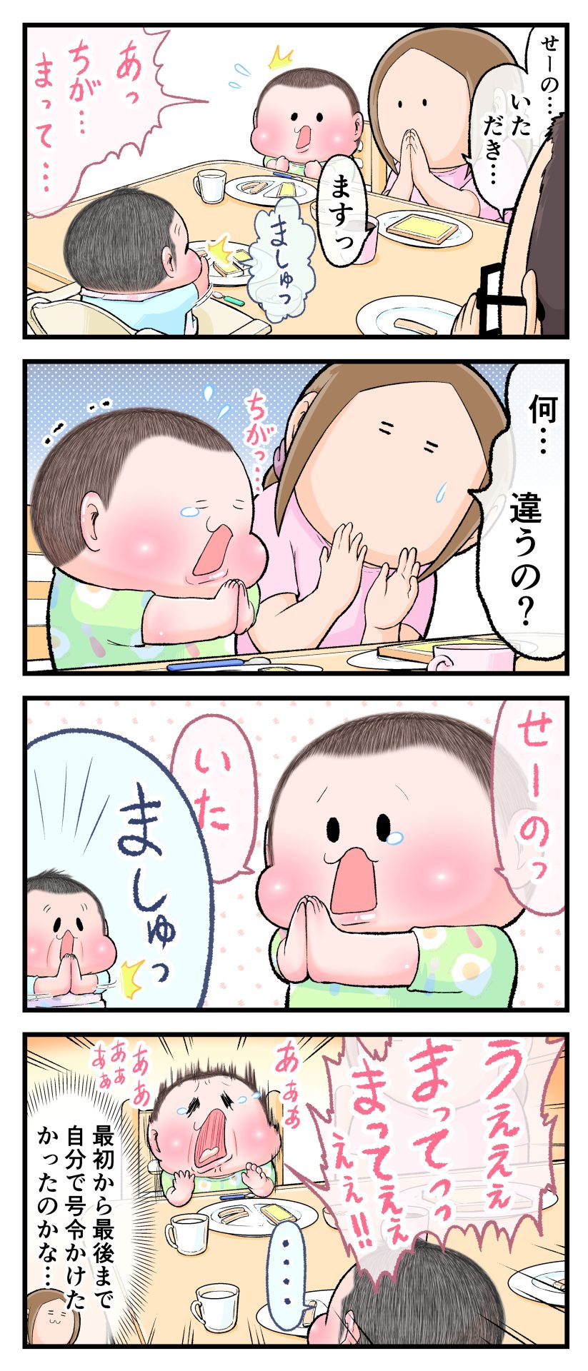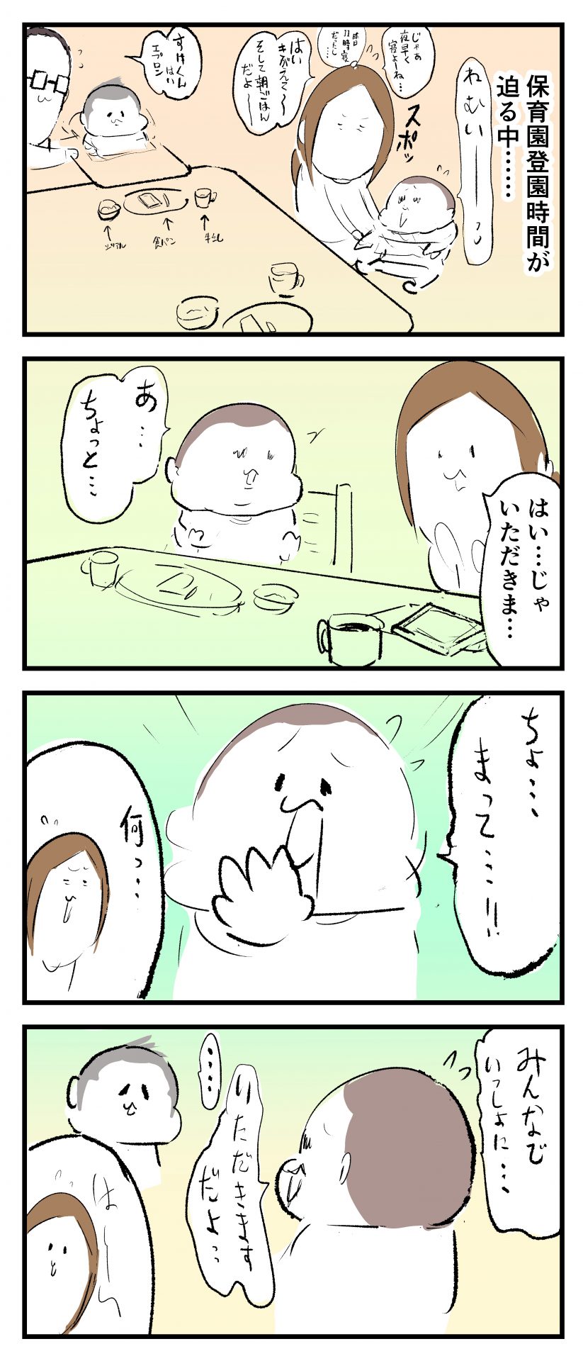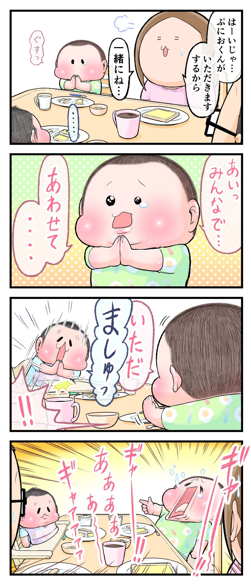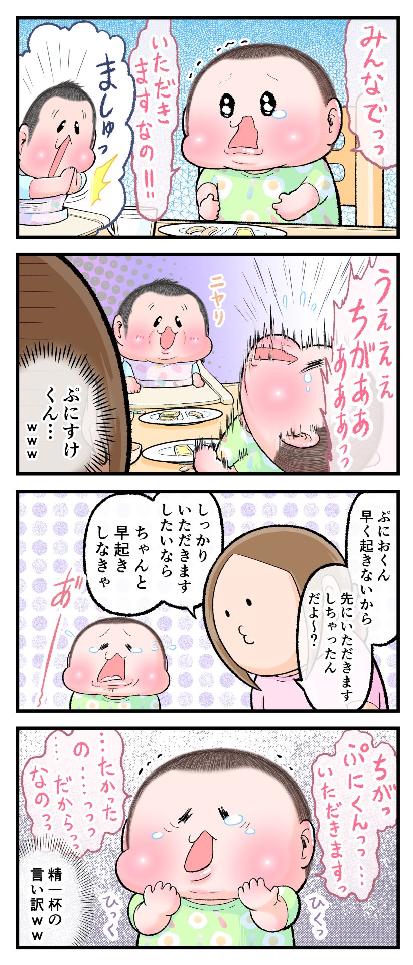怒涛のいただきます2021.04.272歳 3歳 育児漫画 ぷにお:3歳7か月 ぷにすけ:2歳3ヶ月頃 広告 ラフ絵 広告 あとがきこんな感じで朝は色んな場面でバッタバタしてます(早くも体力ゲージがそがれてゆきます‥)。 6 同じカテゴリの記事 思わず二度聞き…!7歳ぷにすけの人生名言→からのギャップ ぷにおにとっての学校とは…?時間割より気になる“あれ” なにその内緒話…!給食のチーズドリアでぷにおが秘密にしたかったあるできごととは…!? #22 巻き起こせ!正の”時短”スパイラル!使い方でこんなに変わる、洗濯機のヒミツ 登校前のギリギリ時間!「待ってほしい」8歳が放った一言が強すぎた…! お母さんの誕生日、欲しいものは…?子どもたちに現実を突きつけられた話~授乳中の、胸が痛む一人時間 生後4ヶ月の赤ちゃんが会長すぎる…!ファミレスでの“会議みたいなしぐさ”がたまらない 生後2ヶ月の赤ちゃんと初ファミレスへ→まさかの「4対1席」に!?子連れ外食のコツも 「寒っ…!」7ヶ月赤ちゃん、ムチムチボディーを震わせててたまらなかった件 #21 テッカテカの君が尊い!はじめての育児で、ついマメにやっちゃう”ひと手間” スパゲティーニプニオニーニ☆8歳息子「目から謎のパスタ」コントの話 腹筋すご!もとの姿勢に戻ろうとする5ヶ月赤ちゃん 5ヶ月赤ちゃんの妹を見つめる兄がつい出た言葉…☆ 離乳食後ににおい…?6ヶ月赤ちゃんのニヤけ顔が何とも言えなかった 6ヶ月赤ちゃんがタグに夢中!ハムハムし尽くした結果… 6ヶ月ぷにみ。おすわりしながら、そっと見上げてくれたあの笑顔 #20 その「ちぱちぱ」は反則~!抱っこ紐の中で1歳息子がくすぐったい攻撃…! 5ヶ月ぷにみ、離乳食デビュー。初めての味への反応は…?③ 5ヶ月ぷにみ、離乳食デビュー。初めての味への反応は…?② 5ヶ月ぷにみ、離乳食デビュー。初めての味への反応は…?① 何かを味わってる?4ヶ月赤ちゃんのお口の動きが尊い件 なんだこの口の動きは…生後4ヶ月ぷにみ、もぐもぐを真似する 「こっち見て~☆」3ヶ月ぷにみ、授乳中のアイコンタクトが止まらない #19 妙に腰をくねらせる~!息子の「出してるよ」サインが、バリエーション豊富な件 ハイパーご機嫌おっぱいタイム☆4ヶ月ぷにみのあんよの動き 5ヶ月ぷにみ、コロコロからのこの動きがたまらない 立たせると笑う!?立つのが好きすぎる3〜4ヶ月のぷにみ 2ヶ月で立ちたい!?おむつ替え中に足ピーンするぷにみ ぷにみ会長にメロメロすぎるぷにすけ社長㉑ #18 「子育てに理解ある職場か」だけが判断基準じゃない。それでも、働き方を変えた理由 かわいい乳歯の破壊力…☆ 歯じめまして!が見えた瞬間…急遽閉ざされた小さなお口 ザ・貫禄 赤ちゃんの笑いの合格音、今日も鳴りました タオルで拭かれてるだけなのに可愛さが限界突破する赤ちゃん なぜか脚マッサージが効いた件 #17 「お母さんと寝よう…?」この後、3歳息子の”あざとさ”にキュンとなる…♡ 思い出のぬいぐるみが繋ぐ兄妹の時間 まんまるなお口☆ 音読の宿題中に起きた言い間違い事件 トイレ直前の舞い 鷲掴み♡ #16 「おかあさん、もすもすしよう!」息子からの謎の誘い☆尊さで心がはちきれそうになった件 ぷにおが感じた、ぷにみのほっぺの感触 ぷにおが思うぷにみの将来 謎のあっちむいてほいゲーム 脱衣所バーテンダー 気持ちだけでも嬉しかった件 そもそもぷにすけ ぷにみ会長にメロメロすぎるぷにすけ社長⑳ #15 深夜の授乳中、旦那からの「お茶とアヒルの差し入れ」が最高に嬉しかった理由 ぷにみ会長にメロメロすぎるぷにすけ社長⑲ ぷにみ会長にメロメロすぎるぷにすけ社長⑱ ぷにみ会長にメロメロすぎるぷにすけ社長⑰ ぷにみ会長にメロメロすぎるぷにすけ社長⑯ 小さな体からすごい音!ぷにみのびっくりサウンド! ぷにみ会長にメロメロすぎるぷにすけ社長⑮ ぷにみ会長にメロメロすぎるぷにすけ社長⑭ ぷにみ会長にメロメロすぎるぷにすけ社長⑬ ぷにみ会長にメロメロすぎるぷにすけ社長⑫ ぷにみ会長にメロメロすぎるぷにすけ社長⑪ ぷにみ会長にメロメロすぎるぷにすけ社長⑩ #14 緊張してる?泣きそうかも~!ドキドキの「はじめてのバースデーフォト」体験 ぷにみ会長にメロメロすぎるぷにすけ社長⑨ ぷにみ会長にメロメロすぎるぷにすけ社長⑧ ぷにみ会長にメロメロすぎるぷにすけ社長⑦ ぷにみ会長にメロメロすぎるぷにすけ社長⑥ ぷにみ会長にメロメロすぎるぷにすけ社長⑤ #13 友人おすすめの”出産時の便利グッズ”。半信半疑で買ったら…本当に大活躍だった! ぷにみ会長にメロメロすぎるぷにすけ社長④ ぷにみ会長にメロメロすぎるぷにすけ社長③ ぷにみ会長にメロメロすぎるぷにすけ社長② ぷにみ会長にメロメロすぎるぷにすけ社長① ノリノリぷにお 寝かしつけ中のパパ…ぷにみの小さなおててがつかんだものとは…☆ #12 「さっきはゴメンね…!」1歳次男の”おわびの気持ち”がなかなかシュールだった件☆ 起動した瞬間(その2) ダジャレにハマるぷにすけ、「校長先生」のくだりが秀