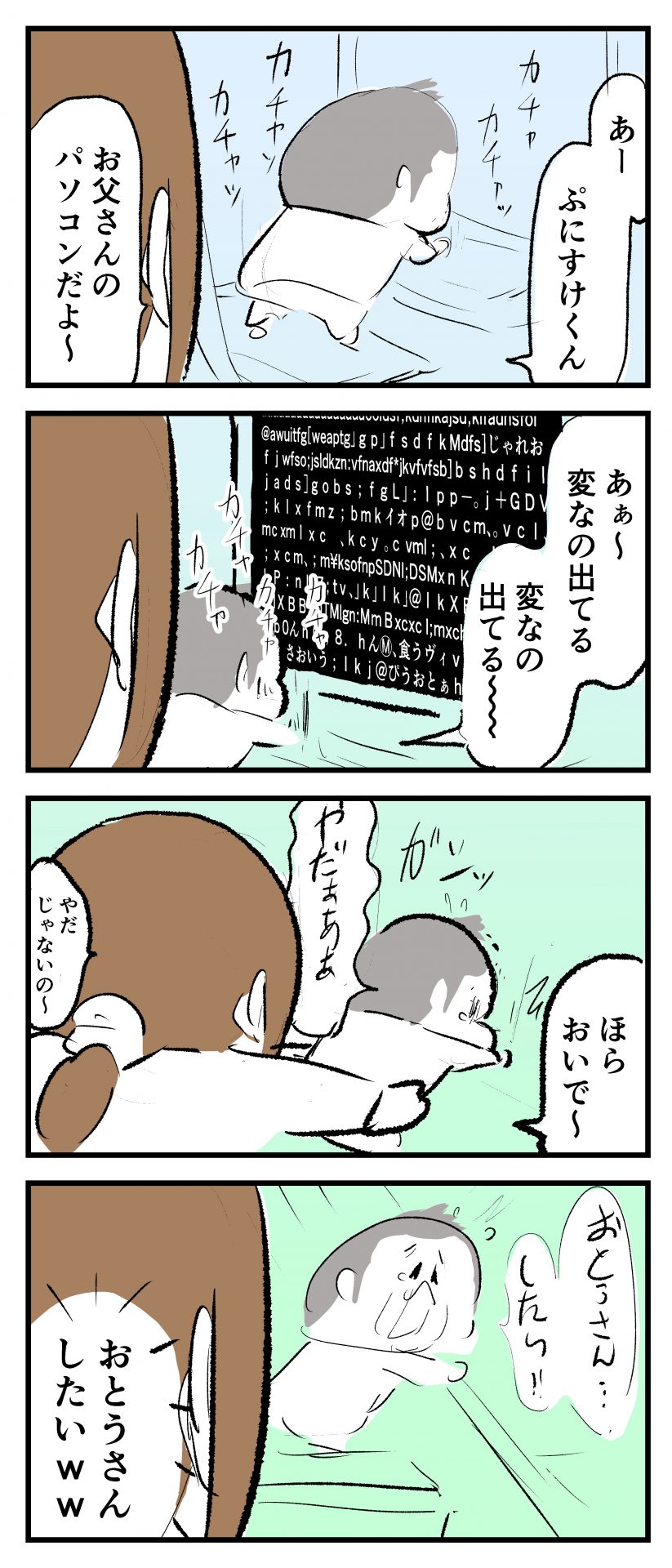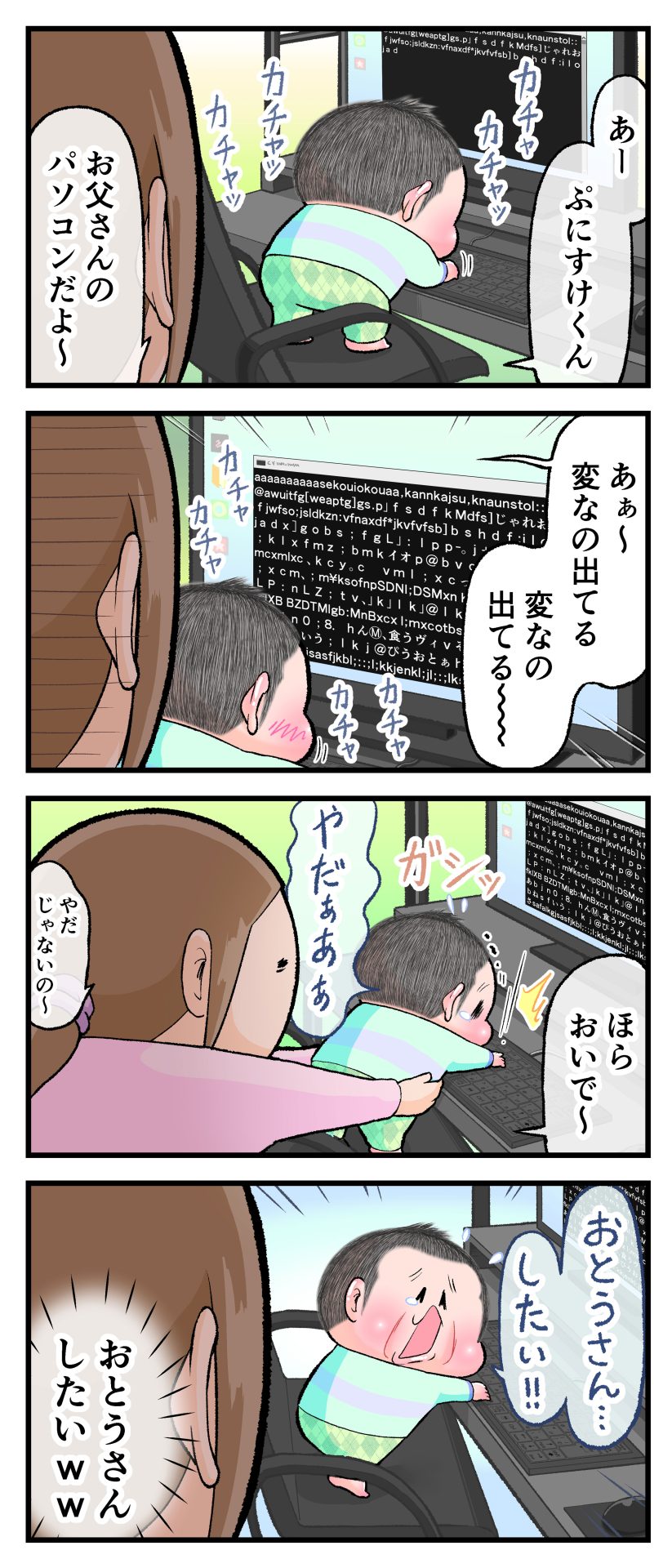 ぷにすけのお仕事①2021.05.061歳 育児漫画 ぷにすけ:1歳10ヶ月頃 ラフ絵 あとがき 当時コロナ禍の登園自粛期間中でした。在宅ワーク中のおとうさんを見ていて自分もやりたくなったようです。スキあらばキーボードカチャカチャして変な画面にしていました。(ちなみにPCは無事でした。) 5 同じカテゴリの記事 思わず二度聞き…!7歳ぷにすけの人生名言→からのギャップ ぷにおにとっての学校とは…?時間割より気になる“あれ” なにその内緒話…!給食のチーズドリアでぷにおが秘密にしたかったあるできごととは…!? #22 巻き起こせ!正の”時短”スパイラル!使い方でこんなに変わる、洗濯機のヒミツ 登校前のギリギリ時間!「待ってほしい」8歳が放った一言が強すぎた…! お母さんの誕生日、欲しいものは…?子どもたちに現実を突きつけられた話~授乳中の、胸が痛む一人時間 生後4ヶ月の赤ちゃんが会長すぎる…!ファミレスでの“会議みたいなしぐさ”がたまらない 生後2ヶ月の赤ちゃんと初ファミレスへ→まさかの「4対1席」に!?子連れ外食のコツも 「寒っ…!」7ヶ月赤ちゃん、ムチムチボディーを震わせててたまらなかった件 #21 テッカテカの君が尊い!はじめての育児で、ついマメにやっちゃう”ひと手間” スパゲティーニプニオニーニ☆8歳息子「目から謎のパスタ」コントの話 腹筋すご!もとの姿勢に戻ろうとする5ヶ月赤ちゃん 5ヶ月赤ちゃんの妹を見つめる兄がつい出た言葉…☆ 離乳食後ににおい…?6ヶ月赤ちゃんのニヤけ顔が何とも言えなかった 6ヶ月赤ちゃんがタグに夢中!ハムハムし尽くした結果… 6ヶ月ぷにみ。おすわりしながら、そっと見上げてくれたあの笑顔 #20 その「ちぱちぱ」は反則~!抱っこ紐の中で1歳息子がくすぐったい攻撃…! 5ヶ月ぷにみ、離乳食デビュー。初めての味への反応は…?③ 5ヶ月ぷにみ、離乳食デビュー。初めての味への反応は…?② 5ヶ月ぷにみ、離乳食デビュー。初めての味への反応は…?① 何かを味わってる?4ヶ月赤ちゃんのお口の動きが尊い件 なんだこの口の動きは…生後4ヶ月ぷにみ、もぐもぐを真似する 「こっち見て~☆」3ヶ月ぷにみ、授乳中のアイコンタクトが止まらない #19 妙に腰をくねらせる~!息子の「出してるよ」サインが、バリエーション豊富な件 ハイパーご機嫌おっぱいタイム☆4ヶ月ぷにみのあんよの動き 5ヶ月ぷにみ、コロコロからのこの動きがたまらない 立たせると笑う!?立つのが好きすぎる3〜4ヶ月のぷにみ 2ヶ月で立ちたい!?おむつ替え中に足ピーンするぷにみ ぷにみ会長にメロメロすぎるぷにすけ社長㉑ #18 「子育てに理解ある職場か」だけが判断基準じゃない。それでも、働き方を変えた理由 かわいい乳歯の破壊力…☆ 歯じめまして!が見えた瞬間…急遽閉ざされた小さなお口 ザ・貫禄 赤ちゃんの笑いの合格音、今日も鳴りました タオルで拭かれてるだけなのに可愛さが限界突破する赤ちゃん なぜか脚マッサージが効いた件 #17 「お母さんと寝よう…?」この後、3歳息子の”あざとさ”にキュンとなる…♡ 思い出のぬいぐるみが繋ぐ兄妹の時間 まんまるなお口☆ 音読の宿題中に起きた言い間違い事件 トイレ直前の舞い 鷲掴み♡ #16 「おかあさん、もすもすしよう!」息子からの謎の誘い☆尊さで心がはちきれそうになった件 ぷにおが感じた、ぷにみのほっぺの感触 ぷにおが思うぷにみの将来 謎のあっちむいてほいゲーム 脱衣所バーテンダー 気持ちだけでも嬉しかった件 そもそもぷにすけ ぷにみ会長にメロメロすぎるぷにすけ社長⑳ #15 深夜の授乳中、旦那からの「お茶とアヒルの差し入れ」が最高に嬉しかった理由 ぷにみ会長にメロメロすぎるぷにすけ社長⑲ ぷにみ会長にメロメロすぎるぷにすけ社長⑱ ぷにみ会長にメロメロすぎるぷにすけ社長⑰ ぷにみ会長にメロメロすぎるぷにすけ社長⑯ 小さな体からすごい音!ぷにみのびっくりサウンド! ぷにみ会長にメロメロすぎるぷにすけ社長⑮ ぷにみ会長にメロメロすぎるぷにすけ社長⑭ ぷにみ会長にメロメロすぎるぷにすけ社長⑬ ぷにみ会長にメロメロすぎるぷにすけ社長⑫ ぷにみ会長にメロメロすぎるぷにすけ社長⑪ ぷにみ会長にメロメロすぎるぷにすけ社長⑩ #14 緊張してる?泣きそうかも~!ドキドキの「はじめてのバースデーフォト」体験 ぷにみ会長にメロメロすぎるぷにすけ社長⑨ ぷにみ会長にメロメロすぎるぷにすけ社長⑧ ぷにみ会長にメロメロすぎるぷにすけ社長⑦ ぷにみ会長にメロメロすぎるぷにすけ社長⑥ ぷにみ会長にメロメロすぎるぷにすけ社長⑤ #13 友人おすすめの”出産時の便利グッズ”。半信半疑で買ったら…本当に大活躍だった! ぷにみ会長にメロメロすぎるぷにすけ社長④ ぷにみ会長にメロメロすぎるぷにすけ社長③ ぷにみ会長にメロメロすぎるぷにすけ社長② ぷにみ会長にメロメロすぎるぷにすけ社長① ノリノリぷにお 寝かしつけ中のパパ…ぷにみの小さなおててがつかんだものとは…☆ #12 「さっきはゴメンね…!」1歳次男の”おわびの気持ち”がなかなかシュールだった