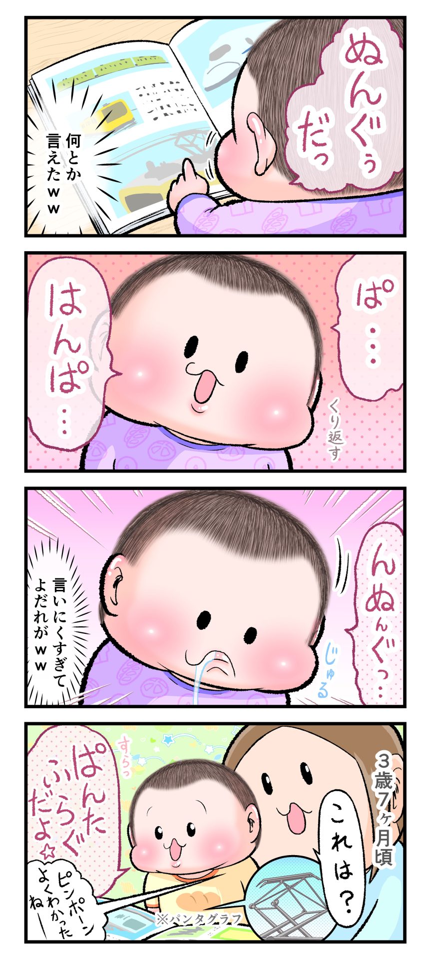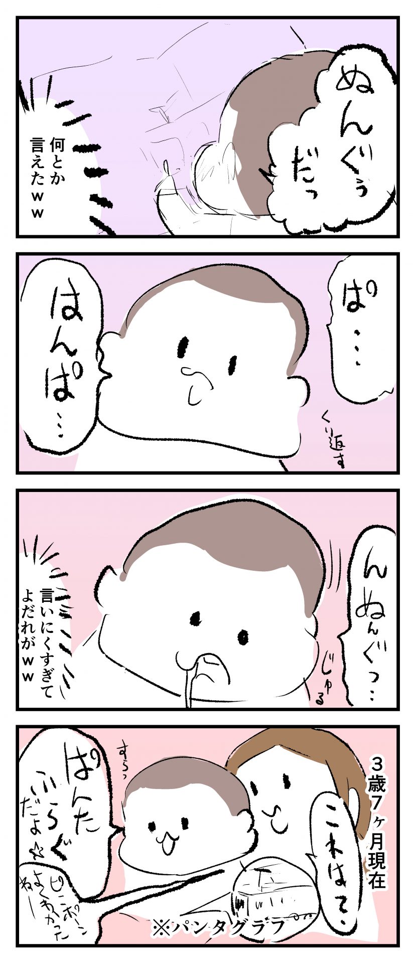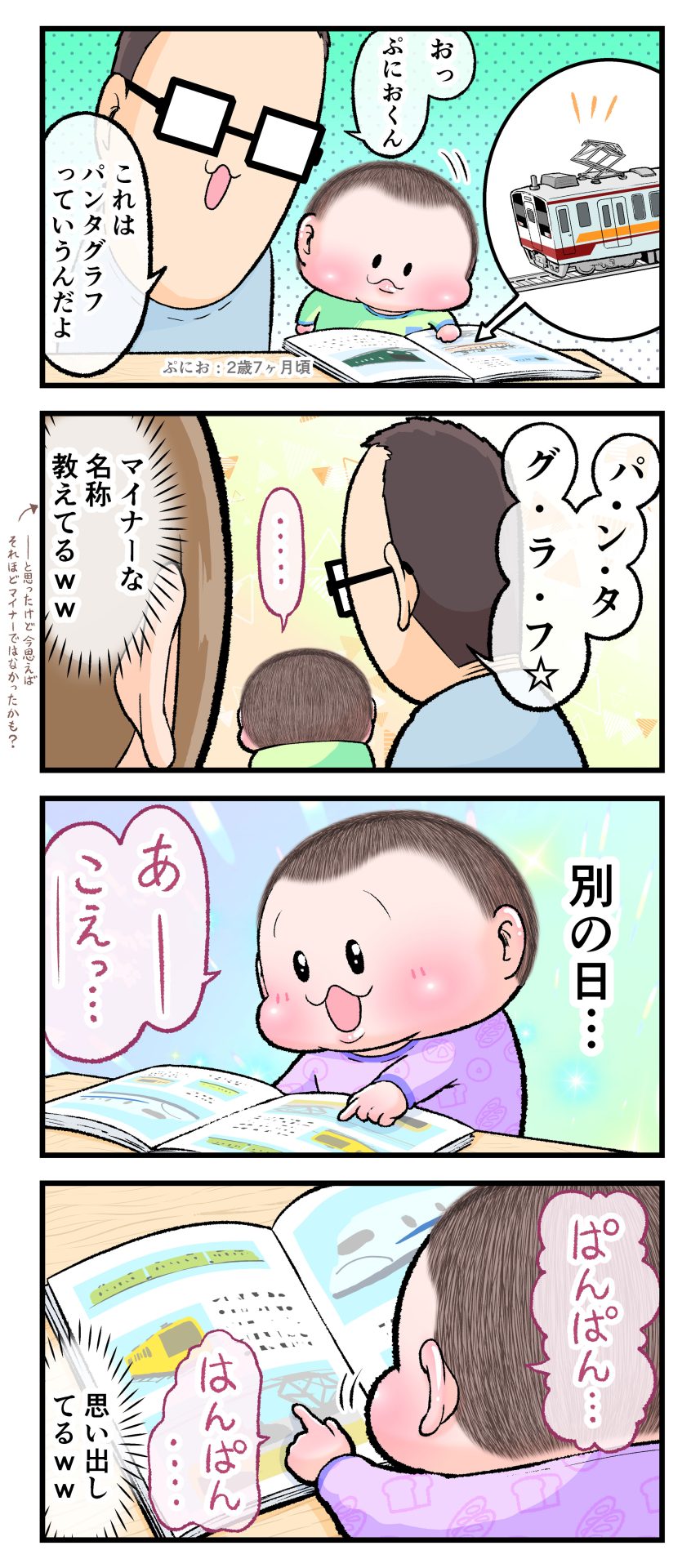 「パンタグラフ」を嚙まずに言えるようになったかと思いきや「グラフ」→「フラグ」となっていて惜しかったのですが、本人はすらすら完璧に言えた気になっていたので、こちらは許容値全開にして言えたことにしていましたw