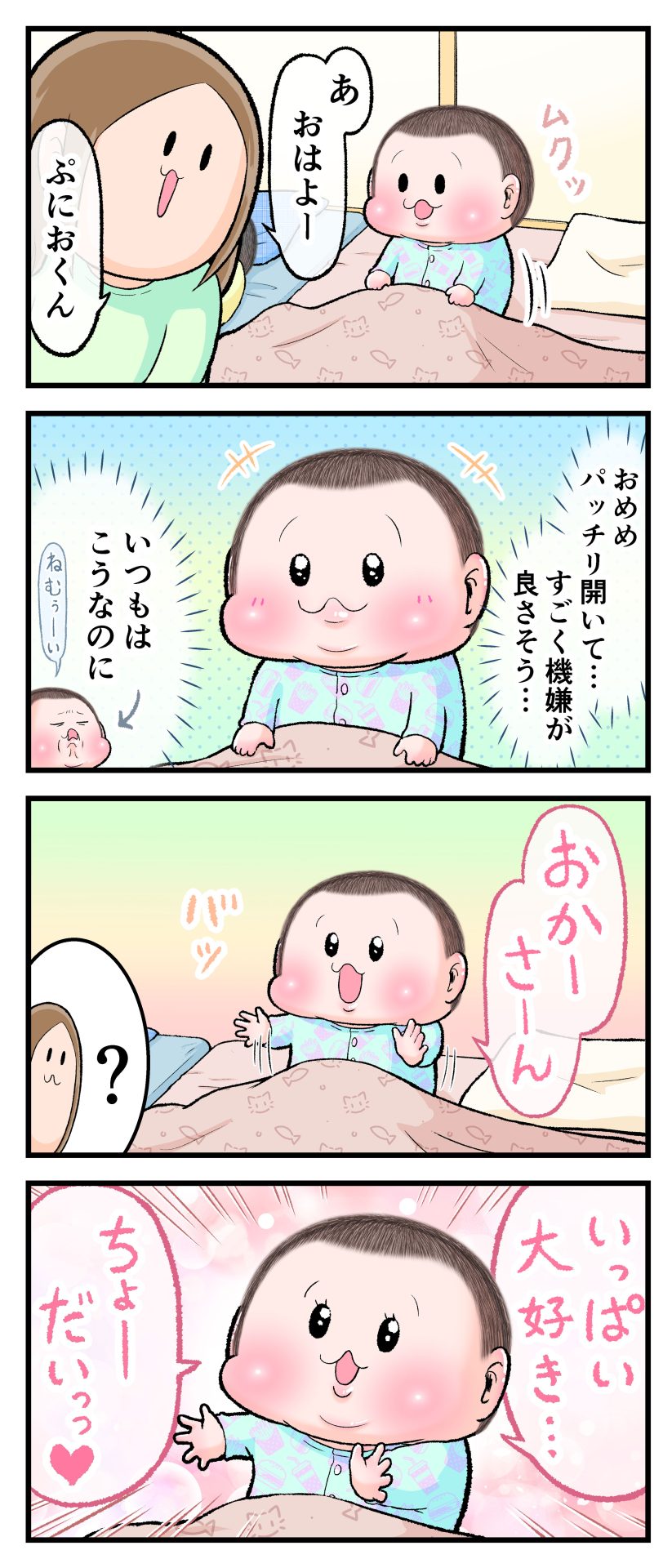 寝起きのひと言2021.05.103歳 育児漫画 ぷにお:3歳6ヶ月頃 ラフ絵 あとがきいっぱい大好きあげました♡ 6 同じカテゴリの記事 思わず二度聞き…!7歳ぷにすけの人生名言→からのギャップ ぷにおにとっての学校とは…?時間割より気になる“あれ” なにその内緒話…!給食のチーズドリアでぷにおが秘密にしたかったあるできごととは…!? #22 巻き起こせ!正の”時短”スパイラル!使い方でこんなに変わる、洗濯機のヒミツ 登校前のギリギリ時間!「待ってほしい」8歳が放った一言が強すぎた…! お母さんの誕生日、欲しいものは…?子どもたちに現実を突きつけられた話~授乳中の、胸が痛む一人時間 生後4ヶ月の赤ちゃんが会長すぎる…!ファミレスでの“会議みたいなしぐさ”がたまらない 生後2ヶ月の赤ちゃんと初ファミレスへ→まさかの「4対1席」に!?子連れ外食のコツも 「寒っ…!」7ヶ月赤ちゃん、ムチムチボディーを震わせててたまらなかった件 #21 テッカテカの君が尊い!はじめての育児で、ついマメにやっちゃう”ひと手間” スパゲティーニプニオニーニ☆8歳息子「目から謎のパスタ」コントの話 腹筋すご!もとの姿勢に戻ろうとする5ヶ月赤ちゃん 5ヶ月赤ちゃんの妹を見つめる兄がつい出た言葉…☆ 離乳食後ににおい…?6ヶ月赤ちゃんのニヤけ顔が何とも言えなかった 6ヶ月赤ちゃんがタグに夢中!ハムハムし尽くした結果… 6ヶ月ぷにみ。おすわりしながら、そっと見上げてくれたあの笑顔 #20 その「ちぱちぱ」は反則~!抱っこ紐の中で1歳息子がくすぐったい攻撃…! 5ヶ月ぷにみ、離乳食デビュー。初めての味への反応は…?③ 5ヶ月ぷにみ、離乳食デビュー。初めての味への反応は…?② 5ヶ月ぷにみ、離乳食デビュー。初めての味への反応は…?① 何かを味わってる?4ヶ月赤ちゃんのお口の動きが尊い件 なんだこの口の動きは…生後4ヶ月ぷにみ、もぐもぐを真似する 「こっち見て~☆」3ヶ月ぷにみ、授乳中のアイコンタクトが止まらない #19 妙に腰をくねらせる~!息子の「出してるよ」サインが、バリエーション豊富な件 ハイパーご機嫌おっぱいタイム☆4ヶ月ぷにみのあんよの動き 5ヶ月ぷにみ、コロコロからのこの動きがたまらない 立たせると笑う!?立つのが好きすぎる3〜4ヶ月のぷにみ 2ヶ月で立ちたい!?おむつ替え中に足ピーンするぷにみ ぷにみ会長にメロメロすぎるぷにすけ社長㉑ #18 「子育てに理解ある職場か」だけが判断基準じゃない。それでも、働き方を変えた理由 かわいい乳歯の破壊力…☆ 歯じめまして!が見えた瞬間…急遽閉ざされた小さなお口 ザ・貫禄 赤ちゃんの笑いの合格音、今日も鳴りました タオルで拭かれてるだけなのに可愛さが限界突破する赤ちゃん なぜか脚マッサージが効いた件 #17 「お母さんと寝よう…?」この後、3歳息子の”あざとさ”にキュンとなる…♡ 思い出のぬいぐるみが繋ぐ兄妹の時間 まんまるなお口☆ 音読の宿題中に起きた言い間違い事件 トイレ直前の舞い 鷲掴み♡ #16 「おかあさん、もすもすしよう!」息子からの謎の誘い☆尊さで心がはちきれそうになった件 ぷにおが感じた、ぷにみのほっぺの感触 ぷにおが思うぷにみの将来 謎のあっちむいてほいゲーム 脱衣所バーテンダー 気持ちだけでも嬉しかった件 そもそもぷにすけ ぷにみ会長にメロメロすぎるぷにすけ社長⑳ #15 深夜の授乳中、旦那からの「お茶とアヒルの差し入れ」が最高に嬉しかった理由 ぷにみ会長にメロメロすぎるぷにすけ社長⑲ ぷにみ会長にメロメロすぎるぷにすけ社長⑱ ぷにみ会長にメロメロすぎるぷにすけ社長⑰ ぷにみ会長にメロメロすぎるぷにすけ社長⑯ 小さな体からすごい音!ぷにみのびっくりサウンド! ぷにみ会長にメロメロすぎるぷにすけ社長⑮ ぷにみ会長にメロメロすぎるぷにすけ社長⑭ ぷにみ会長にメロメロすぎるぷにすけ社長⑬ ぷにみ会長にメロメロすぎるぷにすけ社長⑫ ぷにみ会長にメロメロすぎるぷにすけ社長⑪ ぷにみ会長にメロメロすぎるぷにすけ社長⑩ #14 緊張してる?泣きそうかも~!ドキドキの「はじめてのバースデーフォト」体験 ぷにみ会長にメロメロすぎるぷにすけ社長⑨ ぷにみ会長にメロメロすぎるぷにすけ社長⑧ ぷにみ会長にメロメロすぎるぷにすけ社長⑦ ぷにみ会長にメロメロすぎるぷにすけ社長⑥ ぷにみ会長にメロメロすぎるぷにすけ社長⑤ #13 友人おすすめの”出産時の便利グッズ”。半信半疑で買ったら…本当に大活躍だった! ぷにみ会長にメロメロすぎるぷにすけ社長④ ぷにみ会長にメロメロすぎるぷにすけ社長③ ぷにみ会長にメロメロすぎるぷにすけ社長② ぷにみ会長にメロメロすぎるぷにすけ社長① ノリノリぷにお 寝かしつけ中のパパ…ぷにみの小さなおててがつかんだものとは…☆ #12 「さっきはゴメンね…!」1歳次男の”おわびの気持ち”がなかなかシュールだった件☆ 起動した瞬間(その2) ダジャレにハマるぷにすけ、「校長先生」のくだりが秀逸爆笑展開…! お腹いっぱいになった新生児の反応がたくましすぎた件 #11 「あ~ぶっくりした!」突然の雷