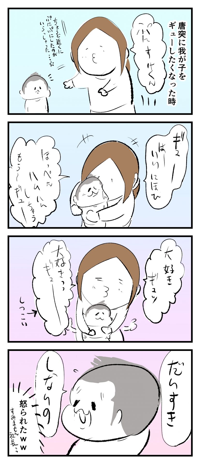 長男次男ともにこの時期くらいから「大好きギュッ」をパッタリしなくなり、我が家のブームが終わりました(泣)