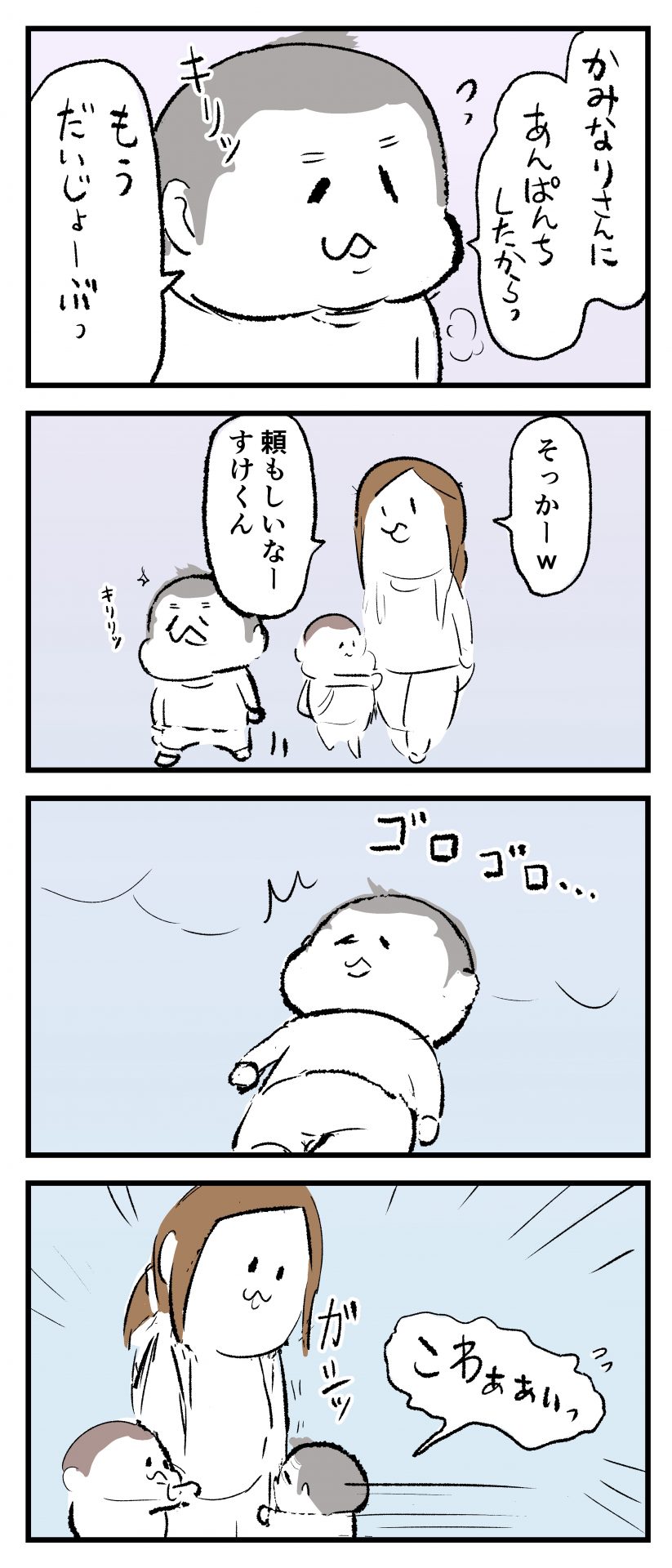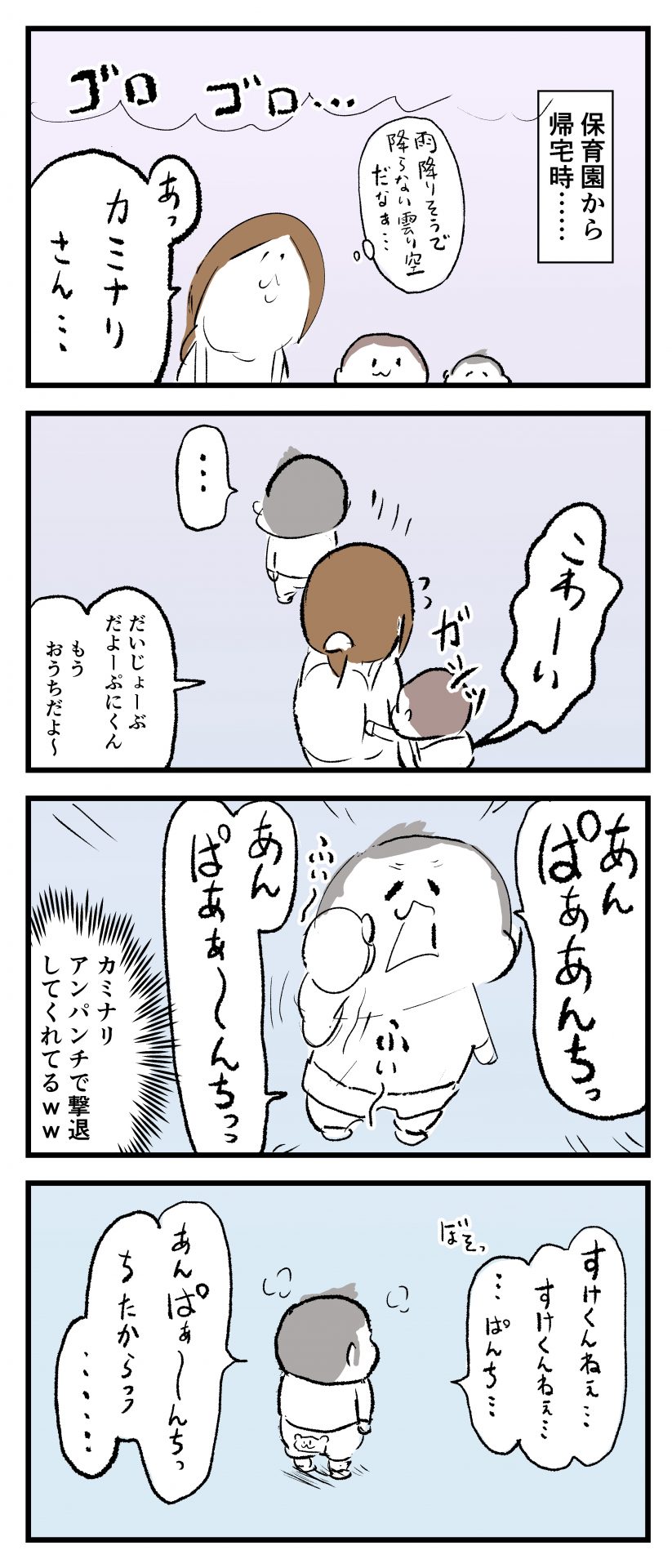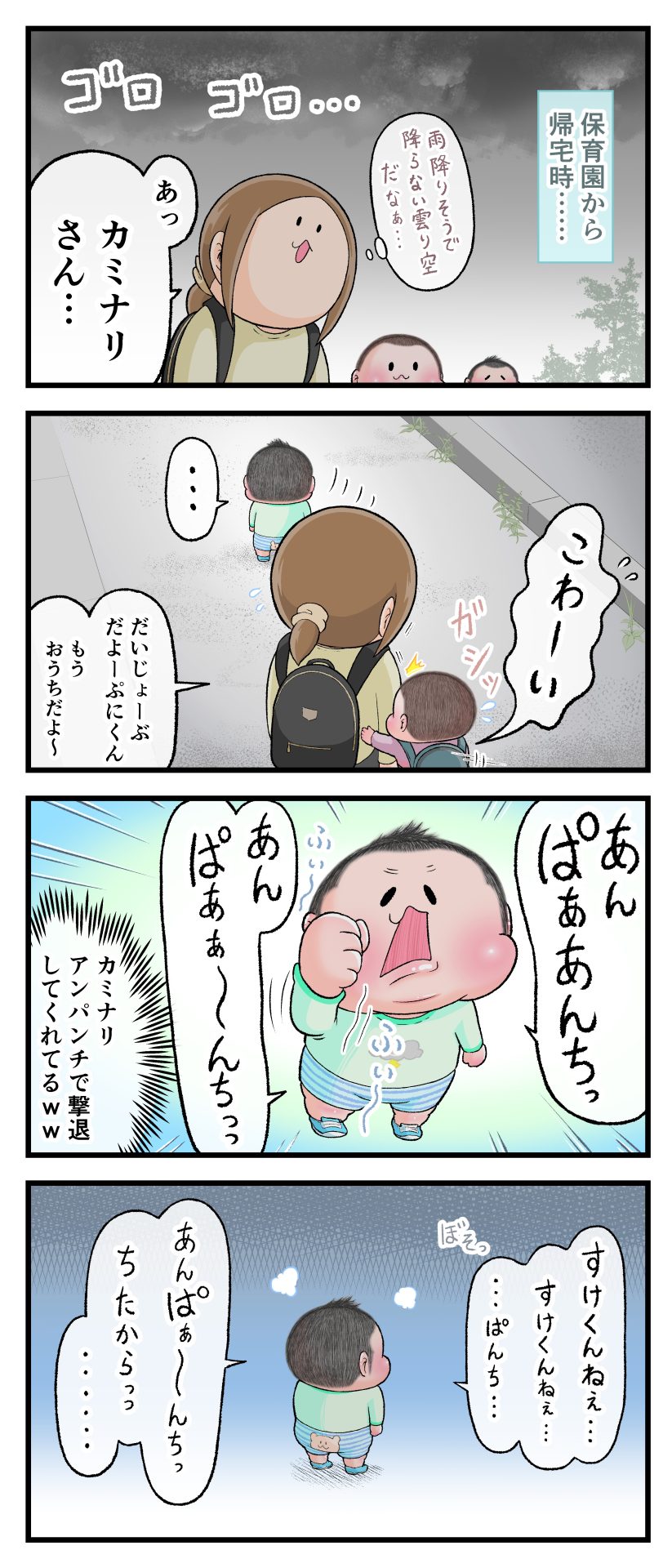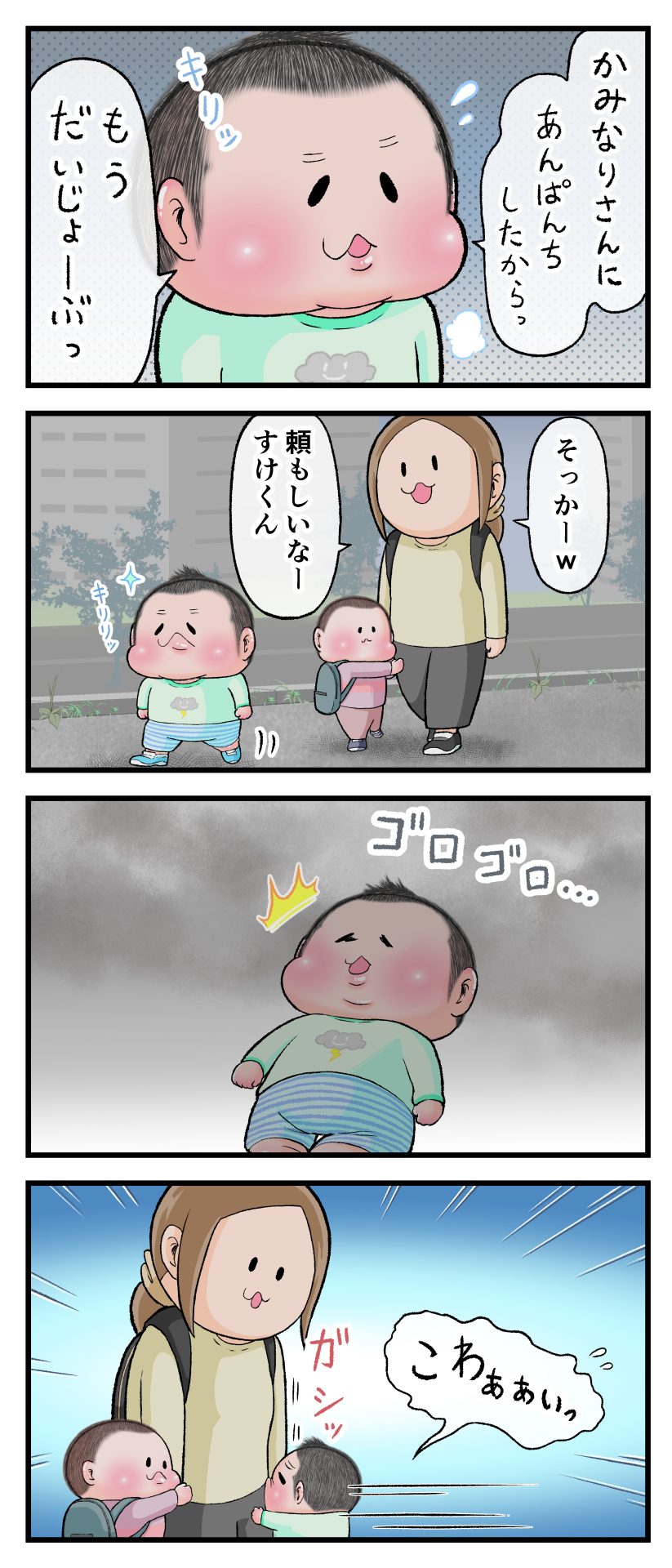 戦うぷにすけ2021.09.102歳 3歳 育児漫画 ぷにお:3歳8ヶ月 ぷにすけ:2歳4ヶ月頃 ラフ絵 あとがき家の中ではわりとカミナリに動じなかったぷにすけは、外だと怖いようでしたww 7 同じカテゴリの記事 思わず二度聞き…!7歳ぷにすけの人生名言→からのギャップ ぷにおにとっての学校とは…?時間割より気になる“あれ” なにその内緒話…!給食のチーズドリアでぷにおが秘密にしたかったあるできごととは…!? #22 巻き起こせ!正の”時短”スパイラル!使い方でこんなに変わる、洗濯機のヒミツ 登校前のギリギリ時間!「待ってほしい」8歳が放った一言が強すぎた…! お母さんの誕生日、欲しいものは…?子どもたちに現実を突きつけられた話~授乳中の、胸が痛む一人時間 生後4ヶ月の赤ちゃんが会長すぎる…!ファミレスでの“会議みたいなしぐさ”がたまらない 生後2ヶ月の赤ちゃんと初ファミレスへ→まさかの「4対1席」に!?子連れ外食のコツも 「寒っ…!」7ヶ月赤ちゃん、ムチムチボディーを震わせててたまらなかった件 #21 テッカテカの君が尊い!はじめての育児で、ついマメにやっちゃう”ひと手間” スパゲティーニプニオニーニ☆8歳息子「目から謎のパスタ」コントの話 腹筋すご!もとの姿勢に戻ろうとする5ヶ月赤ちゃん 5ヶ月赤ちゃんの妹を見つめる兄がつい出た言葉…☆ 離乳食後ににおい…?6ヶ月赤ちゃんのニヤけ顔が何とも言えなかった 6ヶ月赤ちゃんがタグに夢中!ハムハムし尽くした結果… 6ヶ月ぷにみ。おすわりしながら、そっと見上げてくれたあの笑顔 #20 その「ちぱちぱ」は反則~!抱っこ紐の中で1歳息子がくすぐったい攻撃…! 5ヶ月ぷにみ、離乳食デビュー。初めての味への反応は…?③ 5ヶ月ぷにみ、離乳食デビュー。初めての味への反応は…?② 5ヶ月ぷにみ、離乳食デビュー。初めての味への反応は…?① 何かを味わってる?4ヶ月赤ちゃんのお口の動きが尊い件 なんだこの口の動きは…生後4ヶ月ぷにみ、もぐもぐを真似する 「こっち見て~☆」3ヶ月ぷにみ、授乳中のアイコンタクトが止まらない #19 妙に腰をくねらせる~!息子の「出してるよ」サインが、バリエーション豊富な件 ハイパーご機嫌おっぱいタイム☆4ヶ月ぷにみのあんよの動き 5ヶ月ぷにみ、コロコロからのこの動きがたまらない 立たせると笑う!?立つのが好きすぎる3〜4ヶ月のぷにみ 2ヶ月で立ちたい!?おむつ替え中に足ピーンするぷにみ ぷにみ会長にメロメロすぎるぷにすけ社長㉑ #18 「子育てに理解ある職場か」だけが判断基準じゃない。それでも、働き方を変えた理由 かわいい乳歯の破壊力…☆ 歯じめまして!が見えた瞬間…急遽閉ざされた小さなお口 ザ・貫禄 赤ちゃんの笑いの合格音、今日も鳴りました タオルで拭かれてるだけなのに可愛さが限界突破する赤ちゃん なぜか脚マッサージが効いた件 #17 「お母さんと寝よう…?」この後、3歳息子の”あざとさ”にキュンとなる…♡ 思い出のぬいぐるみが繋ぐ兄妹の時間 まんまるなお口☆ 音読の宿題中に起きた言い間違い事件 トイレ直前の舞い 鷲掴み♡ #16 「おかあさん、もすもすしよう!」息子からの謎の誘い☆尊さで心がはちきれそうになった件 ぷにおが感じた、ぷにみのほっぺの感触 ぷにおが思うぷにみの将来 謎のあっちむいてほいゲーム 脱衣所バーテンダー 気持ちだけでも嬉しかった件 そもそもぷにすけ ぷにみ会長にメロメロすぎるぷにすけ社長⑳ #15 深夜の授乳中、旦那からの「お茶とアヒルの差し入れ」が最高に嬉しかった理由 ぷにみ会長にメロメロすぎるぷにすけ社長⑲ ぷにみ会長にメロメロすぎるぷにすけ社長⑱ ぷにみ会長にメロメロすぎるぷにすけ社長⑰ ぷにみ会長にメロメロすぎるぷにすけ社長⑯ 小さな体からすごい音!ぷにみのびっくりサウンド! ぷにみ会長にメロメロすぎるぷにすけ社長⑮ ぷにみ会長にメロメロすぎるぷにすけ社長⑭ ぷにみ会長にメロメロすぎるぷにすけ社長⑬ ぷにみ会長にメロメロすぎるぷにすけ社長⑫ ぷにみ会長にメロメロすぎるぷにすけ社長⑪ ぷにみ会長にメロメロすぎるぷにすけ社長⑩ #14 緊張してる?泣きそうかも~!ドキドキの「はじめてのバースデーフォト」体験 ぷにみ会長にメロメロすぎるぷにすけ社長⑨ ぷにみ会長にメロメロすぎるぷにすけ社長⑧ ぷにみ会長にメロメロすぎるぷにすけ社長⑦ ぷにみ会長にメロメロすぎるぷにすけ社長⑥ ぷにみ会長にメロメロすぎるぷにすけ社長⑤ #13 友人おすすめの”出産時の便利グッズ”。半信半疑で買ったら…本当に大活躍だった! ぷにみ会長にメロメロすぎるぷにすけ社長④ ぷにみ会長にメロメロすぎるぷにすけ社長③ ぷにみ会長にメロメロすぎるぷにすけ社長② ぷにみ会長にメロメロすぎるぷにすけ社長① ノリノリぷにお 寝かしつけ中のパパ…ぷにみの小さなおててがつかんだものとは…☆ #12 「さっきはゴメンね…!」1歳次男の”おわびの気持ち”がなかなかシュールだった件☆ 起動した瞬間(その2) ダジャレにハマるぷにすけ、「校長先生」のくだりが秀逸爆笑展開…! お腹いっぱいにな