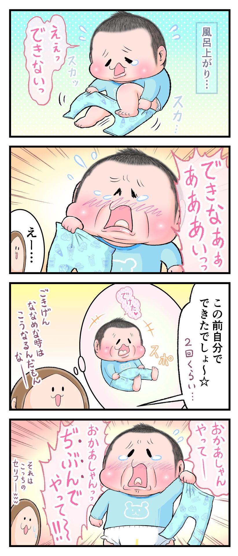 2歳11ヶ月頃から自分で着れることが増えてきましたが、気分によってはなかなか着ようとせず、「ほらお洋服ここだよ~」と側に服を置いても、シャツやズボンを持ちながらしばらく家の中を裸ん坊で歩き回るので、急かしたり自分でできるまで見ておくのになかなか時間を取られていました‥orz