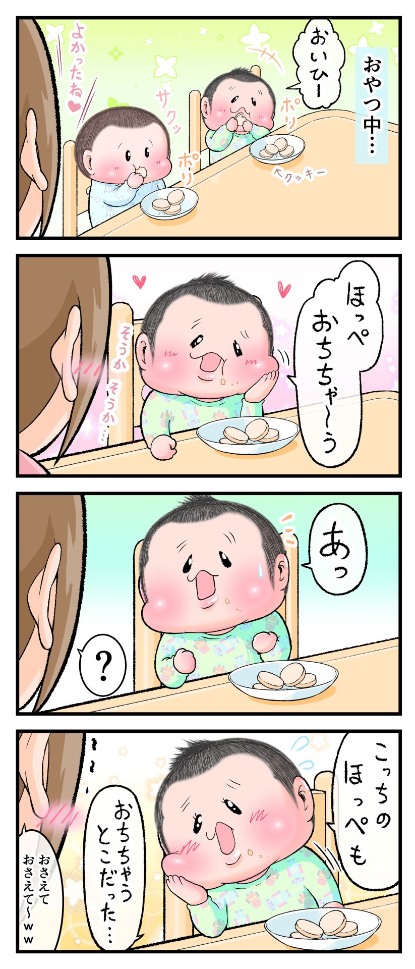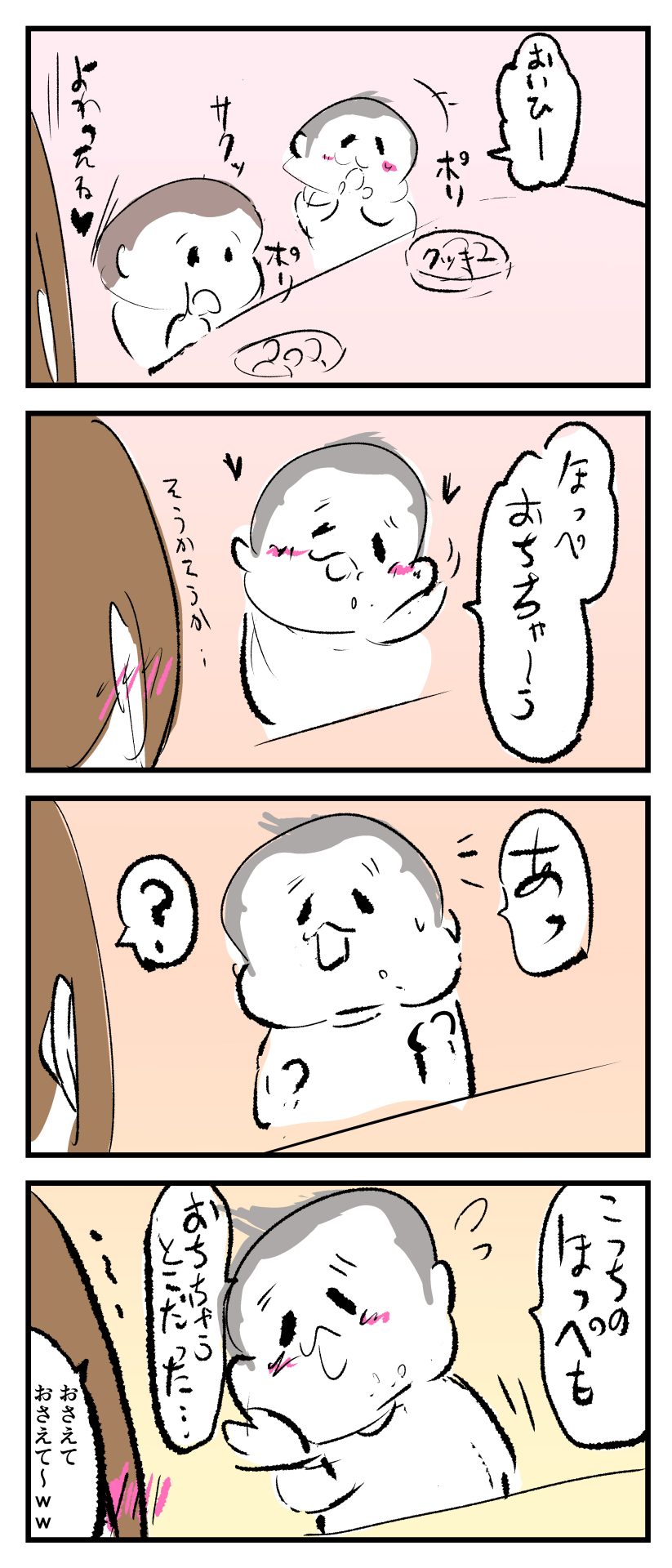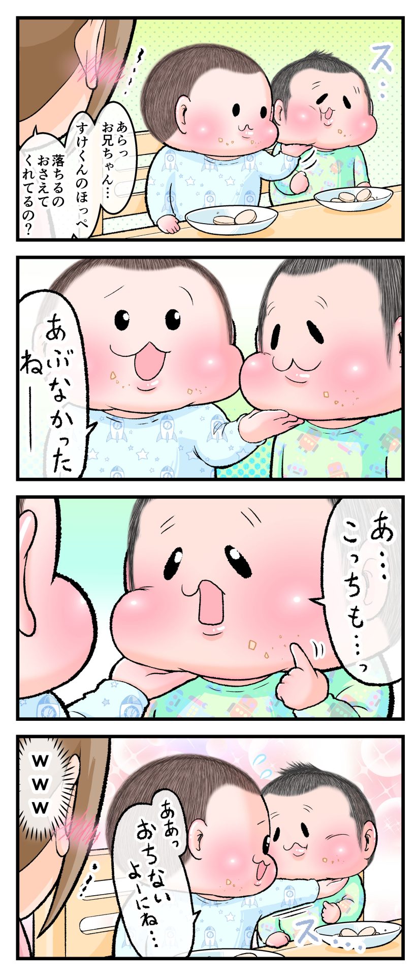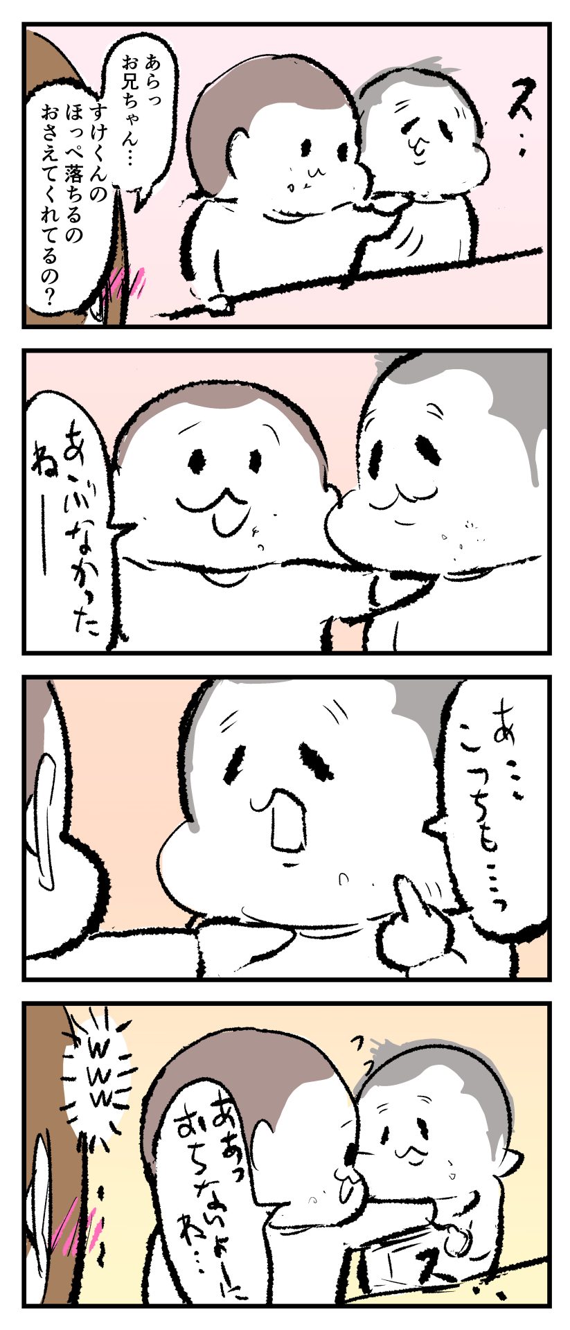 おちそうなほっぺ2021.11.202歳 4歳 育児漫画 ぷにお:4歳2ヶ月 ぷにすけ:2歳10ヶ月 頃 ラフ絵 あとがき母はそんなほっぺをパクッとしたくなりましたw 8 同じカテゴリの記事 思わず二度聞き…!7歳ぷにすけの人生名言→からのギャップ ぷにおにとっての学校とは…?時間割より気になる“あれ” なにその内緒話…!給食のチーズドリアでぷにおが秘密にしたかったあるできごととは…!? #22 巻き起こせ!正の”時短”スパイラル!使い方でこんなに変わる、洗濯機のヒミツ 登校前のギリギリ時間!「待ってほしい」8歳が放った一言が強すぎた…! お母さんの誕生日、欲しいものは…?子どもたちに現実を突きつけられた話~授乳中の、胸が痛む一人時間 生後4ヶ月の赤ちゃんが会長すぎる…!ファミレスでの“会議みたいなしぐさ”がたまらない 生後2ヶ月の赤ちゃんと初ファミレスへ→まさかの「4対1席」に!?子連れ外食のコツも 「寒っ…!」7ヶ月赤ちゃん、ムチムチボディーを震わせててたまらなかった件 #21 テッカテカの君が尊い!はじめての育児で、ついマメにやっちゃう”ひと手間” スパゲティーニプニオニーニ☆8歳息子「目から謎のパスタ」コントの話 腹筋すご!もとの姿勢に戻ろうとする5ヶ月赤ちゃん 5ヶ月赤ちゃんの妹を見つめる兄がつい出た言葉…☆ 離乳食後ににおい…?6ヶ月赤ちゃんのニヤけ顔が何とも言えなかった 6ヶ月赤ちゃんがタグに夢中!ハムハムし尽くした結果… 6ヶ月ぷにみ。おすわりしながら、そっと見上げてくれたあの笑顔 #20 その「ちぱちぱ」は反則~!抱っこ紐の中で1歳息子がくすぐったい攻撃…! 5ヶ月ぷにみ、離乳食デビュー。初めての味への反応は…?③ 5ヶ月ぷにみ、離乳食デビュー。初めての味への反応は…?② 5ヶ月ぷにみ、離乳食デビュー。初めての味への反応は…?① 何かを味わってる?4ヶ月赤ちゃんのお口の動きが尊い件 なんだこの口の動きは…生後4ヶ月ぷにみ、もぐもぐを真似する 「こっち見て~☆」3ヶ月ぷにみ、授乳中のアイコンタクトが止まらない #19 妙に腰をくねらせる~!息子の「出してるよ」サインが、バリエーション豊富な件 ハイパーご機嫌おっぱいタイム☆4ヶ月ぷにみのあんよの動き 5ヶ月ぷにみ、コロコロからのこの動きがたまらない 立たせると笑う!?立つのが好きすぎる3〜4ヶ月のぷにみ 2ヶ月で立ちたい!?おむつ替え中に足ピーンするぷにみ ぷにみ会長にメロメロすぎるぷにすけ社長㉑ #18 「子育てに理解ある職場か」だけが判断基準じゃない。それでも、働き方を変えた理由 かわいい乳歯の破壊力…☆ 歯じめまして!が見えた瞬間…急遽閉ざされた小さなお口 ザ・貫禄 赤ちゃんの笑いの合格音、今日も鳴りました タオルで拭かれてるだけなのに可愛さが限界突破する赤ちゃん なぜか脚マッサージが効いた件 #17 「お母さんと寝よう…?」この後、3歳息子の”あざとさ”にキュンとなる…♡ 思い出のぬいぐるみが繋ぐ兄妹の時間 まんまるなお口☆ 音読の宿題中に起きた言い間違い事件 トイレ直前の舞い 鷲掴み♡ #16 「おかあさん、もすもすしよう!」息子からの謎の誘い☆尊さで心がはちきれそうになった件 ぷにおが感じた、ぷにみのほっぺの感触 ぷにおが思うぷにみの将来 謎のあっちむいてほいゲーム 脱衣所バーテンダー 気持ちだけでも嬉しかった件 そもそもぷにすけ ぷにみ会長にメロメロすぎるぷにすけ社長⑳ #15 深夜の授乳中、旦那からの「お茶とアヒルの差し入れ」が最高に嬉しかった理由 ぷにみ会長にメロメロすぎるぷにすけ社長⑲ ぷにみ会長にメロメロすぎるぷにすけ社長⑱ ぷにみ会長にメロメロすぎるぷにすけ社長⑰ ぷにみ会長にメロメロすぎるぷにすけ社長⑯ 小さな体からすごい音!ぷにみのびっくりサウンド! ぷにみ会長にメロメロすぎるぷにすけ社長⑮ ぷにみ会長にメロメロすぎるぷにすけ社長⑭ ぷにみ会長にメロメロすぎるぷにすけ社長⑬ ぷにみ会長にメロメロすぎるぷにすけ社長⑫ ぷにみ会長にメロメロすぎるぷにすけ社長⑪ ぷにみ会長にメロメロすぎるぷにすけ社長⑩ #14 緊張してる?泣きそうかも~!ドキドキの「はじめてのバースデーフォト」体験 ぷにみ会長にメロメロすぎるぷにすけ社長⑨ ぷにみ会長にメロメロすぎるぷにすけ社長⑧ ぷにみ会長にメロメロすぎるぷにすけ社長⑦ ぷにみ会長にメロメロすぎるぷにすけ社長⑥ ぷにみ会長にメロメロすぎるぷにすけ社長⑤ #13 友人おすすめの”出産時の便利グッズ”。半信半疑で買ったら…本当に大活躍だった! ぷにみ会長にメロメロすぎるぷにすけ社長④ ぷにみ会長にメロメロすぎるぷにすけ社長③ ぷにみ会長にメロメロすぎるぷにすけ社長② ぷにみ会長にメロメロすぎるぷにすけ社長① ノリノリぷにお 寝かしつけ中のパパ…ぷにみの小さなおててがつかんだものとは…☆ #12 「さっきはゴメンね…!」1歳次男の”おわびの気持ち”がなかなかシュールだった件☆ 起動した瞬間(その2) ダジャレにハマるぷにすけ、「校長先生」のくだりが秀逸爆笑展開…! お腹いっぱいになった新生児の反応がたくま