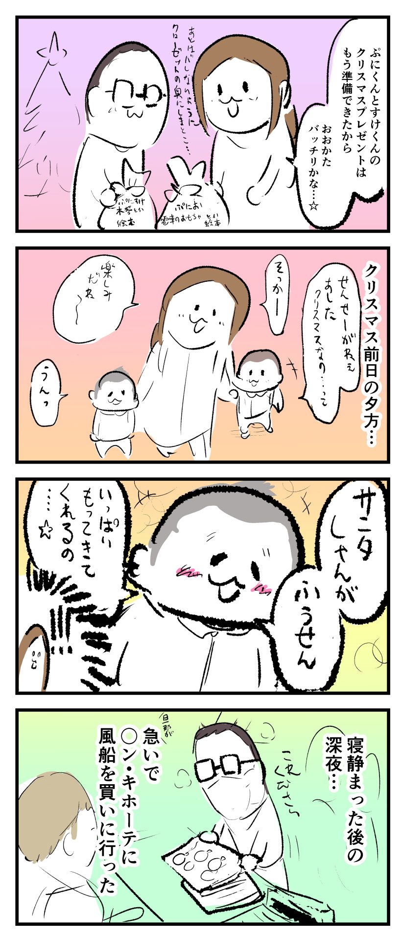 風船大好きぷにすけ⑨2021.12.302歳 4歳 育児漫画 風船大好きぷにすけ ぷにお:4歳3ヶ月 ぷにすけ:2歳11ヶ月頃 あとがきそんなん言われたら……サンタさん頑張るしかない…。 1 同じカテゴリの記事 思わず二度聞き…!7歳ぷにすけの人生名言→からのギャップ ぷにおにとっての学校とは…?時間割より気になる“あれ” なにその内緒話…!給食のチーズドリアでぷにおが秘密にしたかったあるできごととは…!? #22 巻き起こせ!正の”時短”スパイラル!使い方でこんなに変わる、洗濯機のヒミツ 登校前のギリギリ時間!「待ってほしい」8歳が放った一言が強すぎた…! お母さんの誕生日、欲しいものは…?子どもたちに現実を突きつけられた話~授乳中の、胸が痛む一人時間 生後4ヶ月の赤ちゃんが会長すぎる…!ファミレスでの“会議みたいなしぐさ”がたまらない 生後2ヶ月の赤ちゃんと初ファミレスへ→まさかの「4対1席」に!?子連れ外食のコツも 「寒っ…!」7ヶ月赤ちゃん、ムチムチボディーを震わせててたまらなかった件 #21 テッカテカの君が尊い!はじめての育児で、ついマメにやっちゃう”ひと手間” スパゲティーニプニオニーニ☆8歳息子「目から謎のパスタ」コントの話 腹筋すご!もとの姿勢に戻ろうとする5ヶ月赤ちゃん 5ヶ月赤ちゃんの妹を見つめる兄がつい出た言葉…☆ 離乳食後ににおい…?6ヶ月赤ちゃんのニヤけ顔が何とも言えなかった 6ヶ月赤ちゃんがタグに夢中!ハムハムし尽くした結果… 6ヶ月ぷにみ。おすわりしながら、そっと見上げてくれたあの笑顔 #20 その「ちぱちぱ」は反則~!抱っこ紐の中で1歳息子がくすぐったい攻撃…! 5ヶ月ぷにみ、離乳食デビュー。初めての味への反応は…?③ 5ヶ月ぷにみ、離乳食デビュー。初めての味への反応は…?② 5ヶ月ぷにみ、離乳食デビュー。初めての味への反応は…?① 何かを味わってる?4ヶ月赤ちゃんのお口の動きが尊い件 なんだこの口の動きは…生後4ヶ月ぷにみ、もぐもぐを真似する 「こっち見て~☆」3ヶ月ぷにみ、授乳中のアイコンタクトが止まらない #19 妙に腰をくねらせる~!息子の「出してるよ」サインが、バリエーション豊富な件 ハイパーご機嫌おっぱいタイム☆4ヶ月ぷにみのあんよの動き 5ヶ月ぷにみ、コロコロからのこの動きがたまらない 立たせると笑う!?立つのが好きすぎる3〜4ヶ月のぷにみ 2ヶ月で立ちたい!?おむつ替え中に足ピーンするぷにみ ぷにみ会長にメロメロすぎるぷにすけ社長㉑ #18 「子育てに理解ある職場か」だけが判断基準じゃない。それでも、働き方を変えた理由 かわいい乳歯の破壊力…☆ 歯じめまして!が見えた瞬間…急遽閉ざされた小さなお口 ザ・貫禄 赤ちゃんの笑いの合格音、今日も鳴りました タオルで拭かれてるだけなのに可愛さが限界突破する赤ちゃん なぜか脚マッサージが効いた件 #17 「お母さんと寝よう…?」この後、3歳息子の”あざとさ”にキュンとなる…♡ 思い出のぬいぐるみが繋ぐ兄妹の時間 まんまるなお口☆ 音読の宿題中に起きた言い間違い事件 トイレ直前の舞い 鷲掴み♡ #16 「おかあさん、もすもすしよう!」息子からの謎の誘い☆尊さで心がはちきれそうになった件 ぷにおが感じた、ぷにみのほっぺの感触 ぷにおが思うぷにみの将来 謎のあっちむいてほいゲーム 脱衣所バーテンダー 気持ちだけでも嬉しかった件 そもそもぷにすけ ぷにみ会長にメロメロすぎるぷにすけ社長⑳ #15 深夜の授乳中、旦那からの「お茶とアヒルの差し入れ」が最高に嬉しかった理由 ぷにみ会長にメロメロすぎるぷにすけ社長⑲ ぷにみ会長にメロメロすぎるぷにすけ社長⑱ ぷにみ会長にメロメロすぎるぷにすけ社長⑰ ぷにみ会長にメロメロすぎるぷにすけ社長⑯ 小さな体からすごい音!ぷにみのびっくりサウンド! ぷにみ会長にメロメロすぎるぷにすけ社長⑮ ぷにみ会長にメロメロすぎるぷにすけ社長⑭ ぷにみ会長にメロメロすぎるぷにすけ社長⑬ ぷにみ会長にメロメロすぎるぷにすけ社長⑫ ぷにみ会長にメロメロすぎるぷにすけ社長⑪ ぷにみ会長にメロメロすぎるぷにすけ社長⑩ #14 緊張してる?泣きそうかも~!ドキドキの「はじめてのバースデーフォト」体験 ぷにみ会長にメロメロすぎるぷにすけ社長⑨ ぷにみ会長にメロメロすぎるぷにすけ社長⑧ ぷにみ会長にメロメロすぎるぷにすけ社長⑦ ぷにみ会長にメロメロすぎるぷにすけ社長⑥ ぷにみ会長にメロメロすぎるぷにすけ社長⑤ #13 友人おすすめの”出産時の便利グッズ”。半信半疑で買ったら…本当に大活躍だった! ぷにみ会長にメロメロすぎるぷにすけ社長④ ぷにみ会長にメロメロすぎるぷにすけ社長③ ぷにみ会長にメロメロすぎるぷにすけ社長② ぷにみ会長にメロメロすぎるぷにすけ社長① ノリノリぷにお 寝かしつけ中のパパ…ぷにみの小さなおててがつかんだものとは…☆ #12 「さっきはゴメンね…!」1歳次男の”おわびの気持ち”がなかなかシュールだった件☆ 起動した瞬間(その2) ダジャレにハマるぷにすけ、「校長先生」のくだりが秀逸爆笑展開…! お腹いっぱいになっ