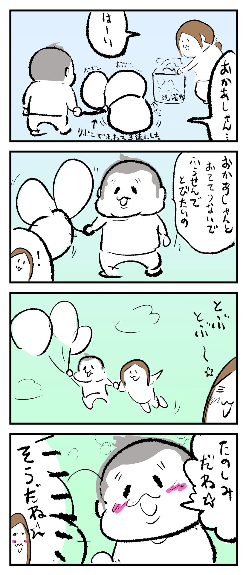 風船大好きぷにすけ⑪2021.12.302歳 育児漫画 風船大好きぷにすけ ぷにすけ:2歳11ヶ月頃 あとがき飛べる気満々のお誘いでしたw 1 同じカテゴリの記事 思わず二度聞き…!7歳ぷにすけの人生名言→からのギャップ ぷにおにとっての学校とは…?時間割より気になる“あれ” なにその内緒話…!給食のチーズドリアでぷにおが秘密にしたかったあるできごととは…!? #22 巻き起こせ!正の”時短”スパイラル!使い方でこんなに変わる、洗濯機のヒミツ 登校前のギリギリ時間!「待ってほしい」8歳が放った一言が強すぎた…! お母さんの誕生日、欲しいものは…?子どもたちに現実を突きつけられた話~授乳中の、胸が痛む一人時間 生後4ヶ月の赤ちゃんが会長すぎる…!ファミレスでの“会議みたいなしぐさ”がたまらない 生後2ヶ月の赤ちゃんと初ファミレスへ→まさかの「4対1席」に!?子連れ外食のコツも 「寒っ…!」7ヶ月赤ちゃん、ムチムチボディーを震わせててたまらなかった件 #21 テッカテカの君が尊い!はじめての育児で、ついマメにやっちゃう”ひと手間” スパゲティーニプニオニーニ☆8歳息子「目から謎のパスタ」コントの話 腹筋すご!もとの姿勢に戻ろうとする5ヶ月赤ちゃん 5ヶ月赤ちゃんの妹を見つめる兄がつい出た言葉…☆ 離乳食後ににおい…?6ヶ月赤ちゃんのニヤけ顔が何とも言えなかった 6ヶ月赤ちゃんがタグに夢中!ハムハムし尽くした結果… 6ヶ月ぷにみ。おすわりしながら、そっと見上げてくれたあの笑顔 #20 その「ちぱちぱ」は反則~!抱っこ紐の中で1歳息子がくすぐったい攻撃…! 5ヶ月ぷにみ、離乳食デビュー。初めての味への反応は…?③ 5ヶ月ぷにみ、離乳食デビュー。初めての味への反応は…?② 5ヶ月ぷにみ、離乳食デビュー。初めての味への反応は…?① 何かを味わってる?4ヶ月赤ちゃんのお口の動きが尊い件 なんだこの口の動きは…生後4ヶ月ぷにみ、もぐもぐを真似する 「こっち見て~☆」3ヶ月ぷにみ、授乳中のアイコンタクトが止まらない #19 妙に腰をくねらせる~!息子の「出してるよ」サインが、バリエーション豊富な件 ハイパーご機嫌おっぱいタイム☆4ヶ月ぷにみのあんよの動き 5ヶ月ぷにみ、コロコロからのこの動きがたまらない 立たせると笑う!?立つのが好きすぎる3〜4ヶ月のぷにみ 2ヶ月で立ちたい!?おむつ替え中に足ピーンするぷにみ ぷにみ会長にメロメロすぎるぷにすけ社長㉑ #18 「子育てに理解ある職場か」だけが判断基準じゃない。それでも、働き方を変えた理由 かわいい乳歯の破壊力…☆ 歯じめまして!が見えた瞬間…急遽閉ざされた小さなお口 ザ・貫禄 赤ちゃんの笑いの合格音、今日も鳴りました タオルで拭かれてるだけなのに可愛さが限界突破する赤ちゃん なぜか脚マッサージが効いた件 #17 「お母さんと寝よう…?」この後、3歳息子の”あざとさ”にキュンとなる…♡ 思い出のぬいぐるみが繋ぐ兄妹の時間 まんまるなお口☆ 音読の宿題中に起きた言い間違い事件 トイレ直前の舞い 鷲掴み♡ #16 「おかあさん、もすもすしよう!」息子からの謎の誘い☆尊さで心がはちきれそうになった件 ぷにおが感じた、ぷにみのほっぺの感触 ぷにおが思うぷにみの将来 謎のあっちむいてほいゲーム 脱衣所バーテンダー 気持ちだけでも嬉しかった件 そもそもぷにすけ ぷにみ会長にメロメロすぎるぷにすけ社長⑳ #15 深夜の授乳中、旦那からの「お茶とアヒルの差し入れ」が最高に嬉しかった理由 ぷにみ会長にメロメロすぎるぷにすけ社長⑲ ぷにみ会長にメロメロすぎるぷにすけ社長⑱ ぷにみ会長にメロメロすぎるぷにすけ社長⑰ ぷにみ会長にメロメロすぎるぷにすけ社長⑯ 小さな体からすごい音!ぷにみのびっくりサウンド! ぷにみ会長にメロメロすぎるぷにすけ社長⑮ ぷにみ会長にメロメロすぎるぷにすけ社長⑭ ぷにみ会長にメロメロすぎるぷにすけ社長⑬ ぷにみ会長にメロメロすぎるぷにすけ社長⑫ ぷにみ会長にメロメロすぎるぷにすけ社長⑪ ぷにみ会長にメロメロすぎるぷにすけ社長⑩ #14 緊張してる?泣きそうかも~!ドキドキの「はじめてのバースデーフォト」体験 ぷにみ会長にメロメロすぎるぷにすけ社長⑨ ぷにみ会長にメロメロすぎるぷにすけ社長⑧ ぷにみ会長にメロメロすぎるぷにすけ社長⑦ ぷにみ会長にメロメロすぎるぷにすけ社長⑥ ぷにみ会長にメロメロすぎるぷにすけ社長⑤ #13 友人おすすめの”出産時の便利グッズ”。半信半疑で買ったら…本当に大活躍だった! ぷにみ会長にメロメロすぎるぷにすけ社長④ ぷにみ会長にメロメロすぎるぷにすけ社長③ ぷにみ会長にメロメロすぎるぷにすけ社長② ぷにみ会長にメロメロすぎるぷにすけ社長① ノリノリぷにお 寝かしつけ中のパパ…ぷにみの小さなおててがつかんだものとは…☆ #12 「さっきはゴメンね…!」1歳次男の”おわびの気持ち”がなかなかシュールだった件☆ 起動した瞬間(その2) ダジャレにハマるぷにすけ、「校長先生」のくだりが秀逸爆笑展開…! お腹いっぱいになった新生児の反応がたくましすぎた件 #11 「あ~