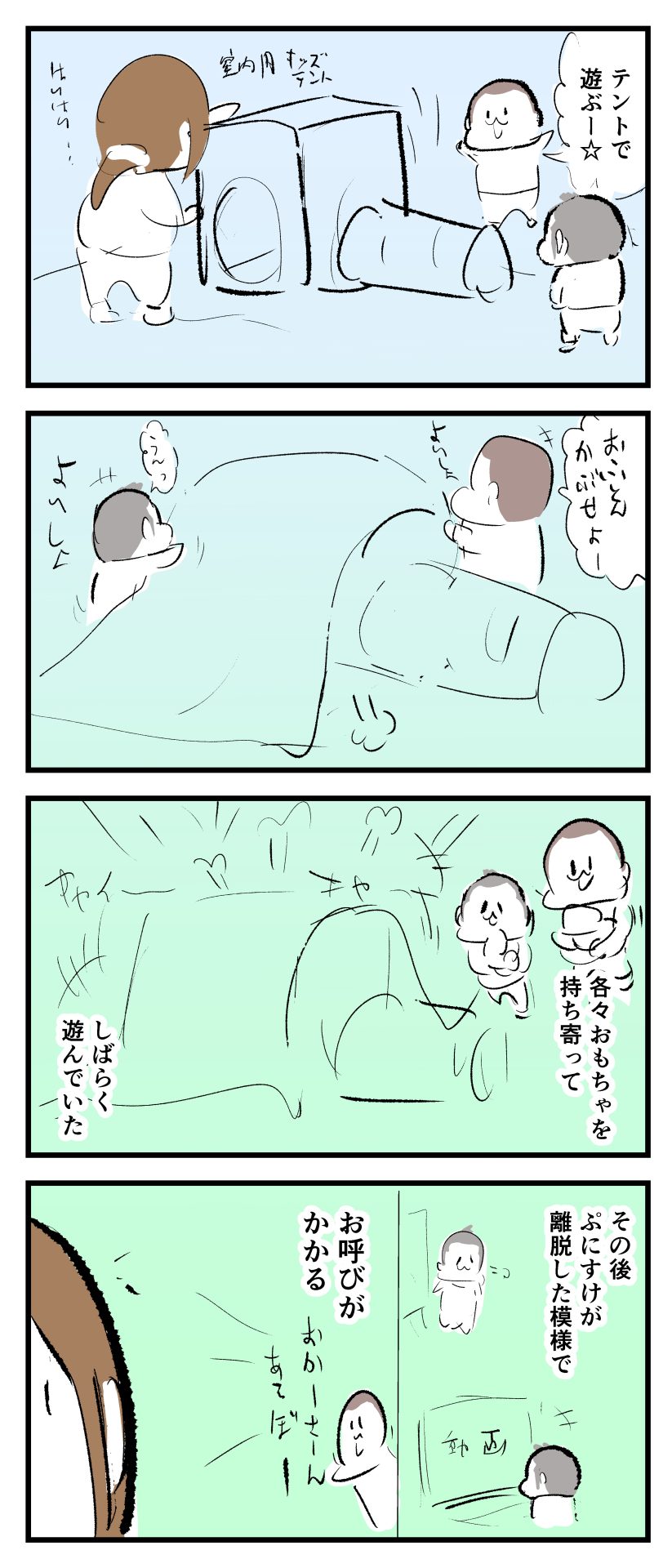 居心地良すぎて…2024.04.035歳 6歳 育児漫画 ぷにお:6歳5ヶ月 ぷにすけ:5歳1ヶ月頃 あとがき──とか言ってましたが、数分後テントの外でまた違う遊びにシフトしてましたw 10 同じカテゴリの記事 思わず二度聞き…!7歳ぷにすけの人生名言→からのギャップ ぷにおにとっての学校とは…?時間割より気になる“あれ” なにその内緒話…!給食のチーズドリアでぷにおが秘密にしたかったあるできごととは…!? #22 巻き起こせ!正の”時短”スパイラル!使い方でこんなに変わる、洗濯機のヒミツ 登校前のギリギリ時間!「待ってほしい」8歳が放った一言が強すぎた…! お母さんの誕生日、欲しいものは…?子どもたちに現実を突きつけられた話~授乳中の、胸が痛む一人時間 生後4ヶ月の赤ちゃんが会長すぎる…!ファミレスでの“会議みたいなしぐさ”がたまらない 生後2ヶ月の赤ちゃんと初ファミレスへ→まさかの「4対1席」に!?子連れ外食のコツも 「寒っ…!」7ヶ月赤ちゃん、ムチムチボディーを震わせててたまらなかった件 #21 テッカテカの君が尊い!はじめての育児で、ついマメにやっちゃう”ひと手間” スパゲティーニプニオニーニ☆8歳息子「目から謎のパスタ」コントの話 腹筋すご!もとの姿勢に戻ろうとする5ヶ月赤ちゃん 5ヶ月赤ちゃんの妹を見つめる兄がつい出た言葉…☆ 離乳食後ににおい…?6ヶ月赤ちゃんのニヤけ顔が何とも言えなかった 6ヶ月赤ちゃんがタグに夢中!ハムハムし尽くした結果… 6ヶ月ぷにみ。おすわりしながら、そっと見上げてくれたあの笑顔 #20 その「ちぱちぱ」は反則~!抱っこ紐の中で1歳息子がくすぐったい攻撃…! 5ヶ月ぷにみ、離乳食デビュー。初めての味への反応は…?③ 5ヶ月ぷにみ、離乳食デビュー。初めての味への反応は…?② 5ヶ月ぷにみ、離乳食デビュー。初めての味への反応は…?① 何かを味わってる?4ヶ月赤ちゃんのお口の動きが尊い件 なんだこの口の動きは…生後4ヶ月ぷにみ、もぐもぐを真似する 「こっち見て~☆」3ヶ月ぷにみ、授乳中のアイコンタクトが止まらない #19 妙に腰をくねらせる~!息子の「出してるよ」サインが、バリエーション豊富な件 ハイパーご機嫌おっぱいタイム☆4ヶ月ぷにみのあんよの動き 5ヶ月ぷにみ、コロコロからのこの動きがたまらない 立たせると笑う!?立つのが好きすぎる3〜4ヶ月のぷにみ 2ヶ月で立ちたい!?おむつ替え中に足ピーンするぷにみ ぷにみ会長にメロメロすぎるぷにすけ社長㉑ #18 「子育てに理解ある職場か」だけが判断基準じゃない。それでも、働き方を変えた理由 かわいい乳歯の破壊力…☆ 歯じめまして!が見えた瞬間…急遽閉ざされた小さなお口 ザ・貫禄 赤ちゃんの笑いの合格音、今日も鳴りました タオルで拭かれてるだけなのに可愛さが限界突破する赤ちゃん なぜか脚マッサージが効いた件 #17 「お母さんと寝よう…?」この後、3歳息子の”あざとさ”にキュンとなる…♡ 思い出のぬいぐるみが繋ぐ兄妹の時間 まんまるなお口☆ 音読の宿題中に起きた言い間違い事件 トイレ直前の舞い 鷲掴み♡ #16 「おかあさん、もすもすしよう!」息子からの謎の誘い☆尊さで心がはちきれそうになった件 ぷにおが感じた、ぷにみのほっぺの感触 ぷにおが思うぷにみの将来 謎のあっちむいてほいゲーム 脱衣所バーテンダー 気持ちだけでも嬉しかった件 そもそもぷにすけ ぷにみ会長にメロメロすぎるぷにすけ社長⑳ #15 深夜の授乳中、旦那からの「お茶とアヒルの差し入れ」が最高に嬉しかった理由 ぷにみ会長にメロメロすぎるぷにすけ社長⑲ ぷにみ会長にメロメロすぎるぷにすけ社長⑱ ぷにみ会長にメロメロすぎるぷにすけ社長⑰ ぷにみ会長にメロメロすぎるぷにすけ社長⑯ 小さな体からすごい音!ぷにみのびっくりサウンド! ぷにみ会長にメロメロすぎるぷにすけ社長⑮ ぷにみ会長にメロメロすぎるぷにすけ社長⑭ ぷにみ会長にメロメロすぎるぷにすけ社長⑬ ぷにみ会長にメロメロすぎるぷにすけ社長⑫ ぷにみ会長にメロメロすぎるぷにすけ社長⑪ ぷにみ会長にメロメロすぎるぷにすけ社長⑩ #14 緊張してる?泣きそうかも~!ドキドキの「はじめてのバースデーフォト」体験 ぷにみ会長にメロメロすぎるぷにすけ社長⑨ ぷにみ会長にメロメロすぎるぷにすけ社長⑧ ぷにみ会長にメロメロすぎるぷにすけ社長⑦ ぷにみ会長にメロメロすぎるぷにすけ社長⑥ ぷにみ会長にメロメロすぎるぷにすけ社長⑤ #13 友人おすすめの”出産時の便利グッズ”。半信半疑で買ったら…本当に大活躍だった! ぷにみ会長にメロメロすぎるぷにすけ社長④ ぷにみ会長にメロメロすぎるぷにすけ社長③ ぷにみ会長にメロメロすぎるぷにすけ社長② ぷにみ会長にメロメロすぎるぷにすけ社長① ノリノリぷにお 寝かしつけ中のパパ…ぷにみの小さなおててがつかんだものとは…☆ #12 「さっきはゴメンね…!」1歳次男の”おわびの気持ち”がなかなかシュールだった件☆ 起動した瞬間(その2) ダジャレにハマるぷにすけ、「校長先生」のくだりが秀逸爆笑展開…! お腹いっぱいになっ